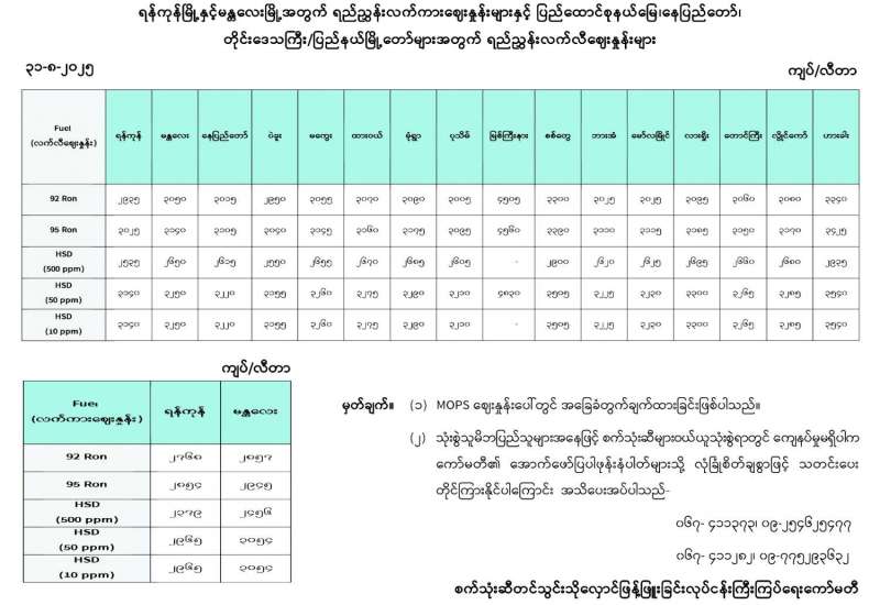 ရန်ကုန်မြို့နှင့် မန္တလေးမြို့အတွက် ရည်ညွှန်းလက်ကားဈေးနှုန်းများနှင့် ပြည်ထောင်စုနယ်မြေ နေပြည်တော်၊ တိုင်းဒေသကြီး/ပြည်နယ် မြို့တော်များအတွက် ရည်ညွှန်းလက်လီဈေးနှုန်းများ