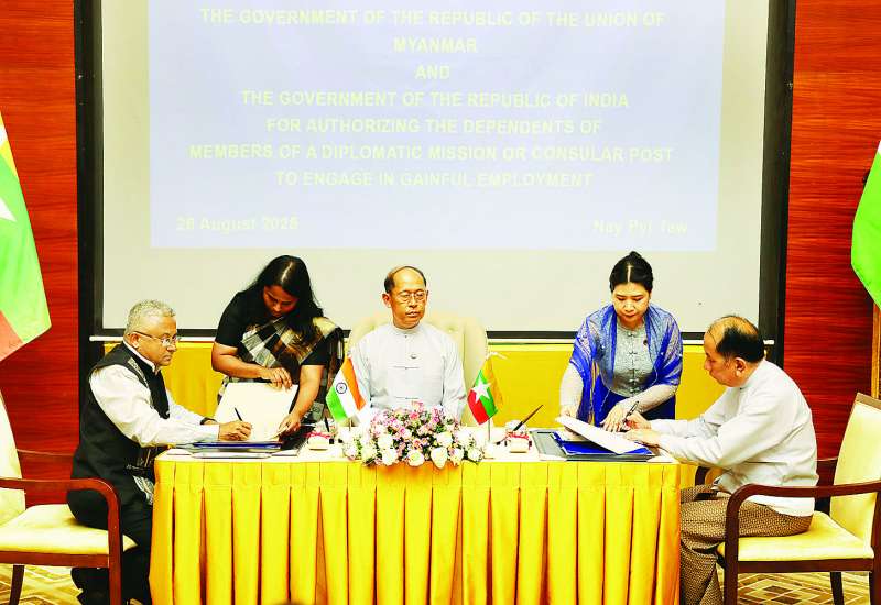 ပြည်ထောင်စုသမ္မတမြန်မာနိုင်ငံတော်အစိုးရနှင့် အိန္ဒိယသမ္မတ နိုင်ငံအစိုးရတို့အကြား သံအဖွဲ့သို့မဟုတ် ကောင်စစ်ဝန်ရုံးတို့မှ အဖွဲ့ဝင်များ၏ မှီခိုသူမိသားစုဝင်များကို အကျိုးအမြတ်ရှိသော အလုပ်အကိုင်များတွင် လုပ်ကိုင်ခွင့်ပြုခြင်း သဘောတူညီချက် လက်မှတ်ရေးထိုးပွဲ အခမ်းအနားကို ယနေ့တွင်နေပြည်တော်ရှိ Park Royal ဟိုတယ်၌ ကျင်းပသည်။