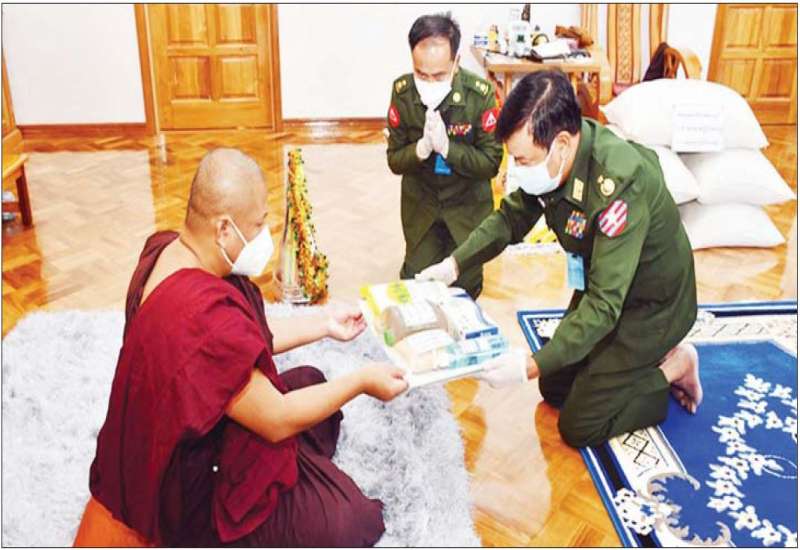 တပ်မတော်(ကြည်း၊ရေ၊လေ) အရာရှိ၊ စစ်သည်၊ အရာထမ်း၊ အမှုထမ်းများနှင့် စေတနာရှင် အလှူရှင်များက ကိုဗစ်-၁၉ ရောဂါ ကြိုတင် ကာကွယ်ရေး လုပ်ငန်းများ ဆောင်ရွက်နေသည့် ကာလအတွင်း ဆွမ်းကိစ္စရပ်များ အဆင်ပြေစေရန် ရည်ရွယ်၍ မြို့နယ်အသီးသီးရှိ ဘုန်းတော်ကြီး ကျောင်းများ၊ သာသနာ့နွယ်ဝင် သီလရှင်ကျောင်းများနှင့် ဘာသာရေးကျောင်းများတွင် ဆွမ်းဆန်တော်၊ ဆီ၊ ဆား၊ ပဲ အမယ်(၄)မျိုးနှင့် လှူဖွယ်ပစ္စည်းများလှူဒါန်းခြင်း၊ နေ့ဆွမ်းများ ဆက်ကပ်လှူဒါန်းခြင်းနှင့် ကျန်းမာရေး စစ်ဆေးပေးခြင်းများကို ဆောင်ရွက်လျက်ရှိသည်။
