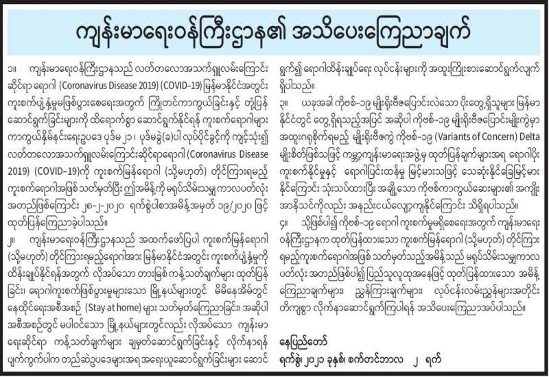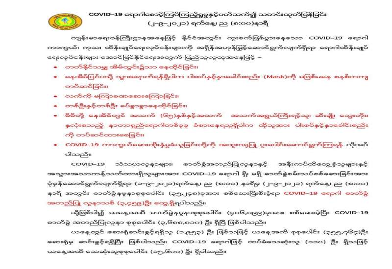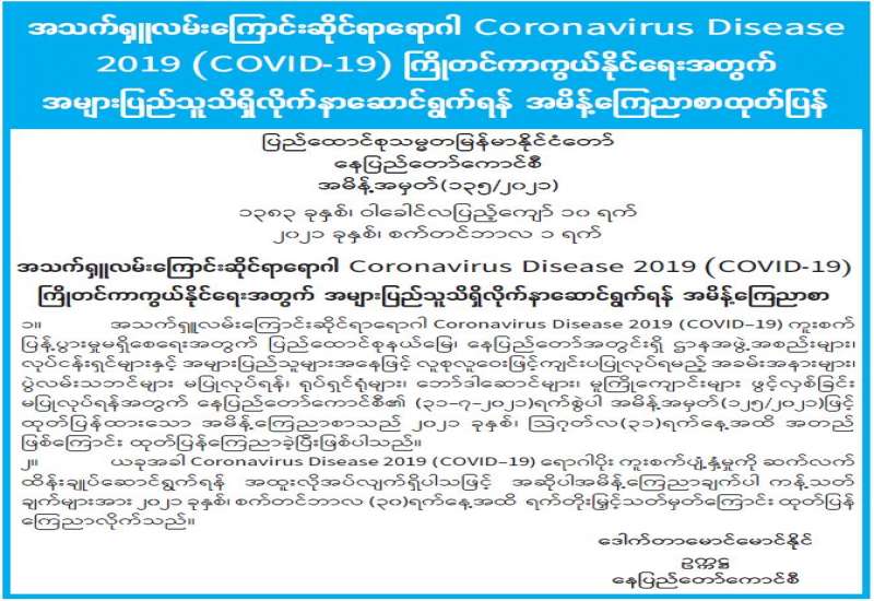 ၁။ ကျန်းမာရေးဝန်ကြီးဌာနသည် လတ်တလော အသက်ရှူလမ်းကြောင်းဆိုင်ရာရောဂါ (Coronavirus Disease 2019) (COVID-19) မြန်မာနိုင်ငံအတွင်း ကူးစက်ပျံ့နှံ့မှုမဖြစ်ပွားစေရေး အတွက် ကြိုတင်ကာကွယ်ခြင်းနှင့် တုံ့ပြန်ဆောင်ရွက်ခြင်းများကို ထိရောက်စွာ ဆောင်ရွက် နိုင်ရန် ကူးစက် ရောဂါများ ကာကွယ်နှိမ်နင်းရေးဥပဒေ ပုဒ်မ ၂၁ ၊ ပုဒ်မခွဲ(ခ)ပါ လုပ်ပိုင်ခွင့်ကို ကျင့်သုံး၍ လတ်တလောအသက်ရှူလမ်းကြောင်းဆိုင်ရာရောဂါ (Coronavirus Disease 2019) (COVID-19)ကို ကူးစက်မြန်ရောဂါ (သို့မဟုတ်) တိုင်ကြားရမည့်ကူးစက်ရောဂါအဖြစ် သတ်မှတ် ပြီး ဤအမိန့်ကို မရုပ်သိမ်းသမျှ ကာလပတ်လုံးအတည်ဖြစ်ကြောင်း ၂၈-၂-၂ဝ၂ဝ ရက်စွဲပါစာ အမိန့်အမှတ် ၁၉/၂၀၂၀ ဖြင့် ထုတ်ပြန်ကြေညာခဲ့ပါသည်။