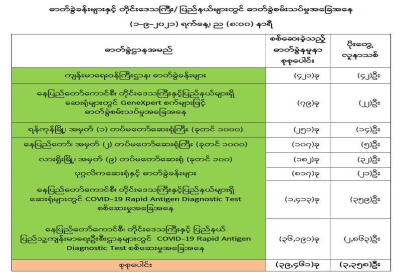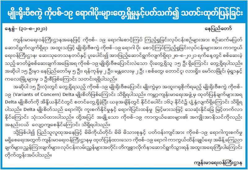 ကျန်းမာရေးဝန်ကြီးဌာနအနေဖြင့် နိုင်ငံအတွင်း ကူးစက်ဖြစ်ပွားနေသော COVID-19 ရောဂါကာကွယ်၊ ကုသ၊ ထိန်းချုပ်ရေးလုပ်ငန်းများကို အရှိန်အဟုန်မြှင့်ဆောင်ရွက်လျက်ရှိရာ ရောဂါထိန်းချုပ်ရေးလုပ်ငန်းများ အောင်မြင်နိုင်ရေးအတွက် ပြည်သူလူထုအနေဖြင့် -