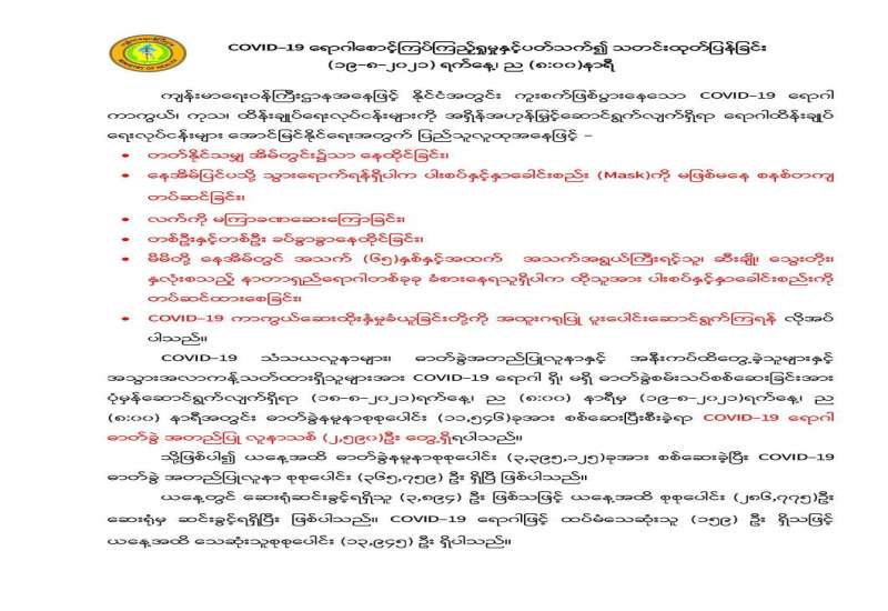 မြန်မာနိုင်ငံကိုဗစ်-၁၉ တတိယလှိုင်းတွင် မြို့နယ်အချို့ကို Stay at Home ချမှတ်ခဲ့ရပြီး ယနေ့ထိတိုင်လည်း Stay at Home မြို့နယ်များ လိုအပ်သလို သတ်မှတ်နေရဆဲဖြစ်သည်။ Stay at Home ခေါ် အိမ်မှာ သာနေရသည့် အစီအစဉ်ကို ချမှတ်ခြင်းမှာ ပြင်ပအသွားအလာများ လျော့ကျသွားစေရန်အတွက် ကန့်သတ်ထိန်းချုပ်ခြင်း ဖြစ်သည်။ ရရှိ လာမည့် အကျိုးရလဒ်မှာ လူတစ်ဦးနှင့်တစ်ဦး ထိတွေ့မှုလျှော့ချနိုင် ကာ ရောဂါကူးစက်ပျံ့နှံ့မှုလမ်းကြောင်းများ ပြတ်တောက်သွားခြင်း ဖြင့် ရောဂါကူးစက်မှုမြင့် တက်နေသည့်အခြေအနေကို တားဆီးနိုင် ခြင်းပင်ဖြစ်သည်။ လူဦးရေထူထပ်သော မြို့ကြီး များတွင် အများ ပြည်သူရုံးပိတ်ရက်ရှည် သတ်မှတ်ခြင်းနှင့် အိမ်မှာသာနေရမည့် အစီ အစဉ်ချ မှတ်ခြင်းတို့၏ အကျိုးကျေးဇူးကြောင့် ကပ်ရောဂါကူးစက် ပျံ့နှံ့မှု သိသိသာသာလျော့ ကျသွားခဲ့သည်ကို တွေ့ရသည်။