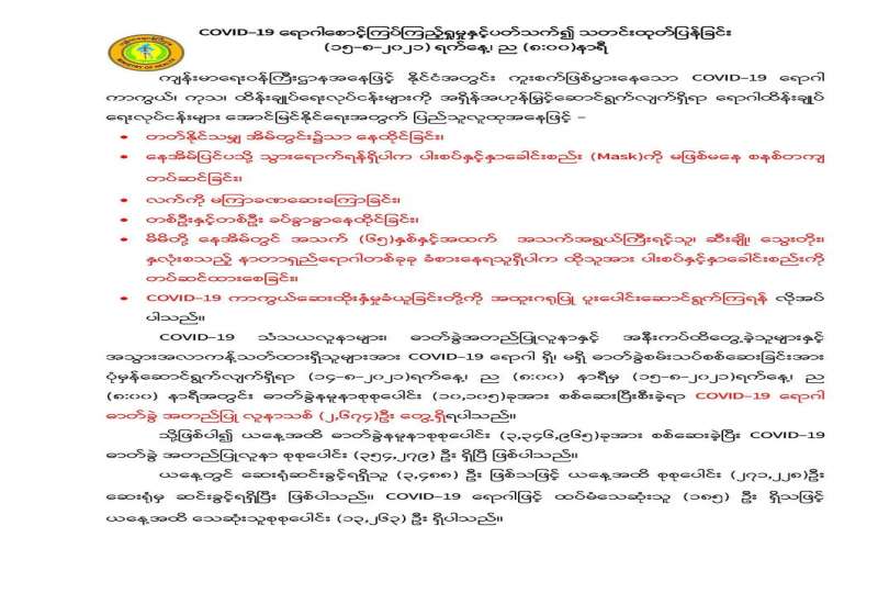 မြန်မာ့အသံနှင့် ရုပ်မြင်သံကြားမှ ဩဂုတ် ၁၄ ရက် ည ၈ နာရီ သတင်း အပြီးတွင် ထုတ်လွှင့် ပြသခဲ့သည့် ကိုဗစ်-၁၉ ရောဂါ ကာကွယ်ထိန်းချုပ်ရေးဆိုင်ရာ ဆောင်ရွက်ချက်များ အကြောင်း သိကောင်းစရာအစီအစဉ်ကို ပြည်သူများသိရှိနိုင်ရန်အတွက် ပြန်လည်ဖော်ပြလိုက်ပါသည်။ ။