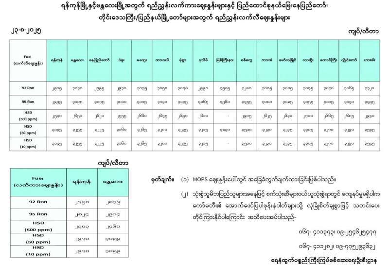 ရန်ကုန်မြို့နှင့် မန္တလေးမြို့အတွက် ရည်ညွှန်းလက်ကားဈေးနှုန်းများနှင့် ပြည်ထောင်စုနယ်မြေ နေပြည်တော်၊ တိုင်းဒေသကြီး/ပြည်နယ် မြို့တော်များအတွက် ရည်ညွှန်းလက်လီဈေးနှုန်းများ