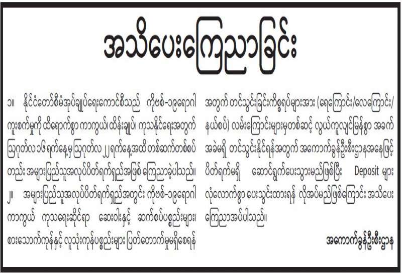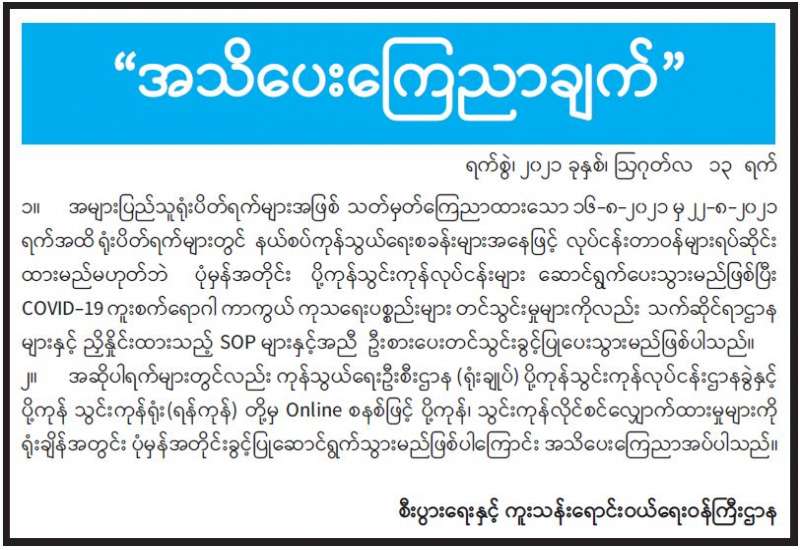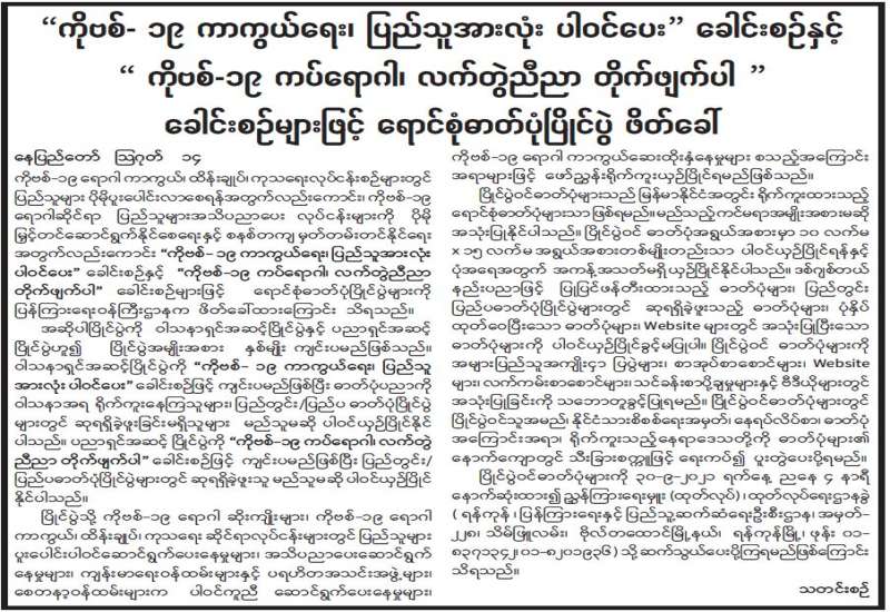 ကျန်းမာရေးဝန်ကြီးဌာနအနေဖြင့် နိုင်ငံအတွင်း ကူးစက်ဖြစ်ပွားနေသော COVID-19 ရောဂါ ကာကွယ်၊ ကုသ၊ ထိန်းချုပ်ရေးလုပ်ငန်းများကို အရှိန်အဟုန်မြှင့်ဆောင်ရွက်လျက်ရှိရာ ရောဂါထိန်းချုပ်ရေးလုပ်ငန်းများ အောင်မြင်နိုင်ရေးအတွက် ပြည်သူလူထုအနေဖြင့် -