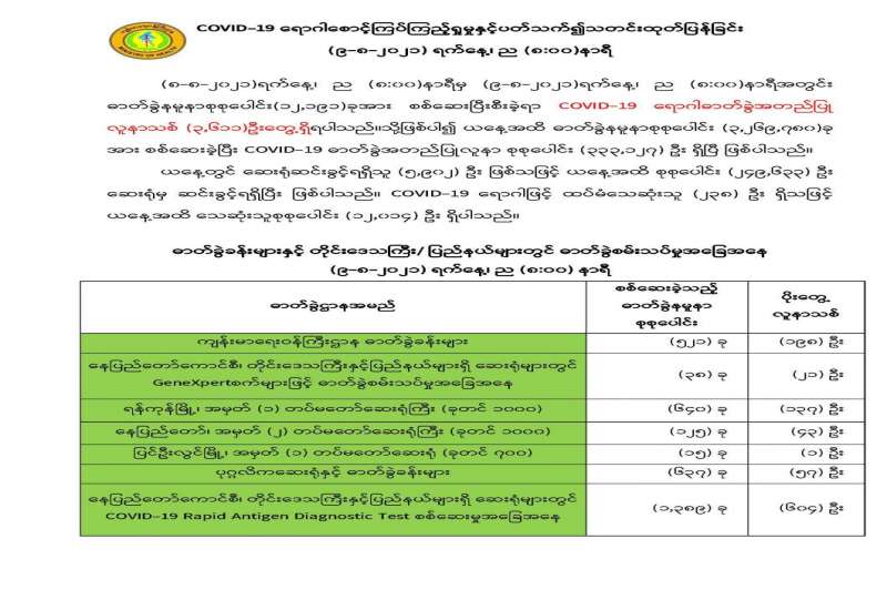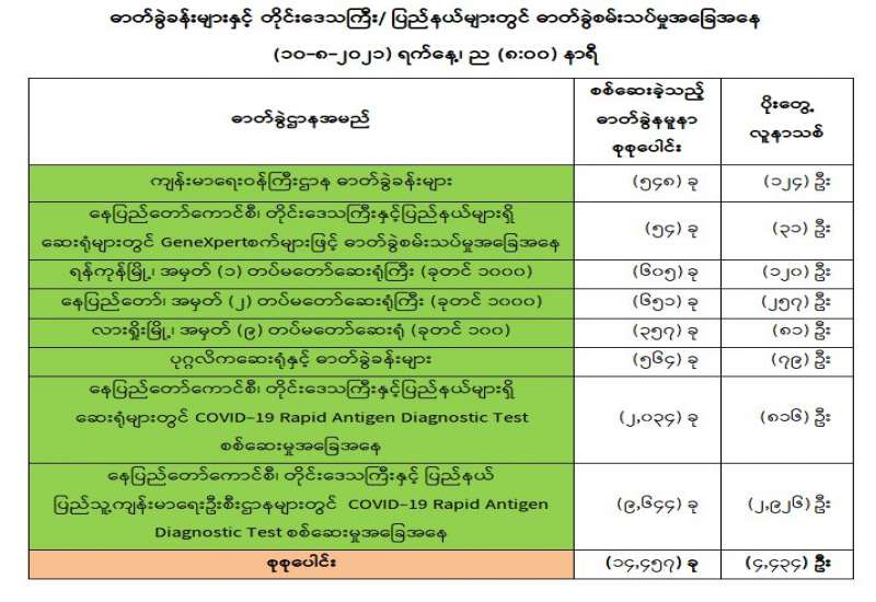 (၉-၈-၂၀၂၁) ရက်နေ့၊ ည (၈:၀၀) နာရီမှ (၁၀-၈-၂၀၂၁) ရက်နေ့၊ ည (၈:၀၀) နာရီအတွင်း ဓာတ်ခွဲနမူနာစုစုပေါင်း (၁၄,၄၅၇) ခုအား စစ်ဆေးပြီးစီးခဲ့ရာ COVID-19 ရောဂါ ဓာတ်ခွဲ အတည်ပြု လူနာသစ် (၄,၄၃၄) ဦး တွေ့ရှိရပါသည်။ သို့ဖြစ်ပါ၍ ယနေ့အထိ ဓာတ်ခွဲနမူနာ စုစုပေါင်း (၃,၂၈၄,၂၃၇) ခု အား စစ်ဆေးခဲ့ပြီး COVID-19 ဓာတ်ခွဲအတည်ပြုလူနာ စုစုပေါင်း (၃၃၇,၅၆၁) ဦး ရှိပြီဖြစ်ပါသည်။
