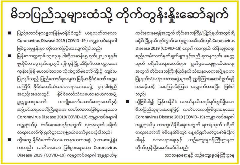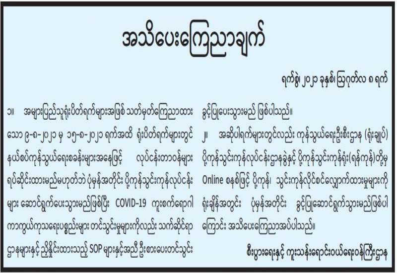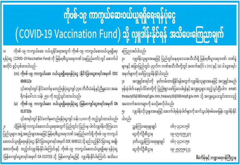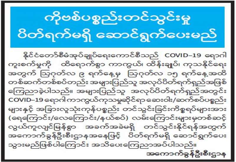 နိုင်ငံတော်အတွင်း၌ ကိုဗစ်-၁၉ ကာကွယ်၊ ထိန်းချုပ်၊ ကုသရေးလုပ်ငန်းများအတွက် အရေးတကြီး လိုအပ် လျက်ရှိသည့် အောက်ဆီဂျင်အရည်၊ အောက်ဆီဂျင် ဓာတ်ငွေ့၊ အိမ်သုံးအောက်ဆီဂျင်စက်၊ ဆေးဝါး နှင့် ဆက်စပ်ပစ္စည်းများ ပြတ်လပ်မှုမရှိစေရန် အများပြည်သူ ရုံးပိတ်ရက်များတွင် လေကြောင်း၊ ရေကြောင်းနှင့် နယ်စပ်ကုန်သွယ်ရေးစခန်းများမှ စဉ်ဆက်မပြတ် တင်သွင်းနိုင်ရေးအတွက် စီးပွားရေးနှင့် ကူးသန်းရောင်းဝယ်ရေးဝန်ကြီးဌာနမှ ဆောင်ရွက်ပေးလျက်ရှိသည်။