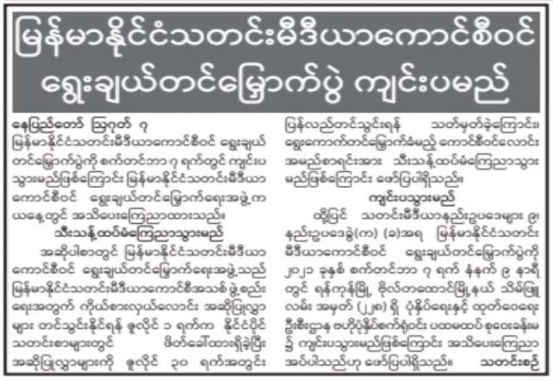 မြန်မာနိုင်ငံသတင်းမီဒီယာကောင်စီဝင် ရွေးချယ်တင်မြှောက်ပွဲကို စက်တင်ဘာ ၇ ရက်တွင် ကျင်းပသွားမည်ဖြစ်ကြောင်း မြန်မာနိုင်ငံသတင်းမီဒီယာကောင်စီဝင် ရွေးချယ်တင်မြှောက်ရေး အဖွဲ့က ယနေ့တွင် အသိပေးကြေညာထားသည်။