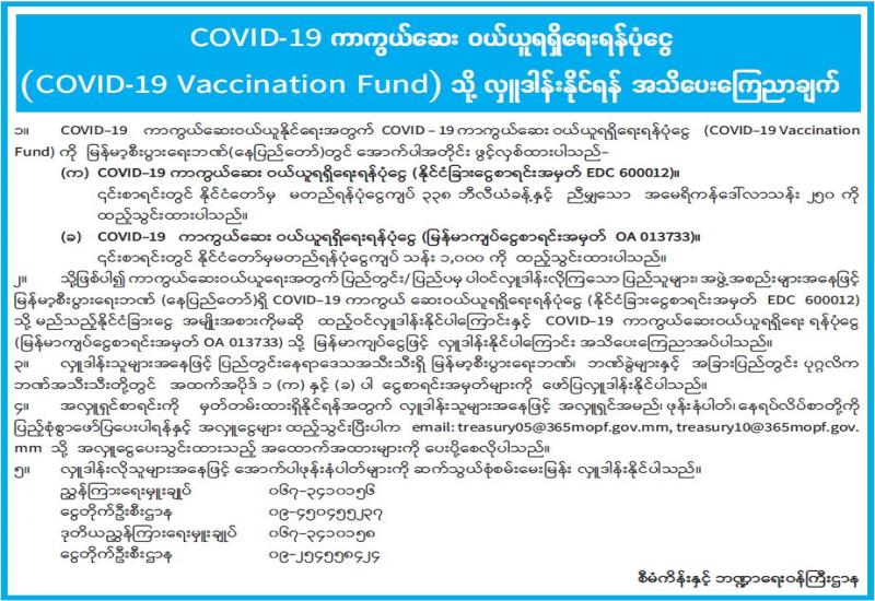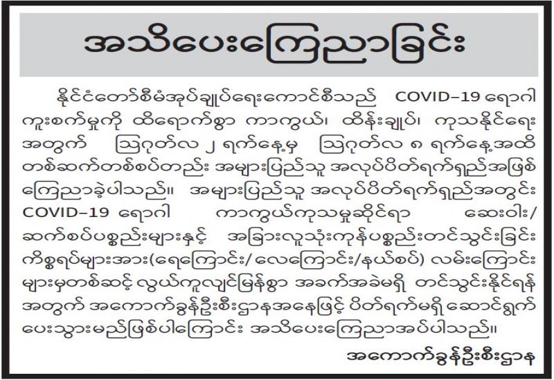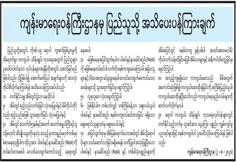 နိုင်ငံတော်အစိုးရအနေဖြင့် ကိုဗစ်-၁၉ ရောဂါ (တတိယလှိုင်း) ကူးစက်ပြန့်ပွားမှု မဖြစ်ပွားမီကာလကပင် လိုအပ်သည့် ကြိုတင်ပြင်ဆင်စုဖွဲ့မှုများကို လုပ်ဆောင်ခဲ့ပြီး ကူးစက်ပြန့်ပွားမှုဖြစ်ပေါ်လာသည့်ကာလအတွင်းတွင်လည်း အတည်ပြုလူနာ၊ စောင့်ကြည့်လူနာ များအား ကျန်ရှိသည့် တာဝန်သိကျန်းမာရေးဝန်ထမ်းများ၊ လူမှုကူညီကယ် ဆယ်ရေးအသင်း အဖွဲ့များနှင့် တပ်မတော်သားကျန်းမာရေးအဖွဲ့များ ပူးပေါင်း၍ ကုသရေးလုပ်ငန်းများကို အင်တိုက်အားတိုက် ဆောင်ရွက်ခဲ့သည်။ ၎င်းအပြင် ရောဂါကူးစက်မှုအရ အရေးပေါ်လိုအပ် လာသည့် အောက်ဆီဂျင်များကို လုံလောက်စွာ ပေးဝေနိုင်ရေးအတွက် ပြည်တွင်းရှိ နိုင်ငံပိုင်နှင့် ပုဂ္ဂလိကပိုင် စက်ရုံ၊ အလုပ်ရုံများမှ တိုးမြှင့်ထုတ်လုပ်ခြင်း၊ ပြည်ပမှလျင်မြန်စွာတင်သွင်းခွင့်ပြုခြင်း စသည်တို့ဖြင့် ပြည်သူလူထု၏ အသက်အိုးအိမ်ကို ထိခိုက်ဆုံးရှုံးမှုမရှိစေရေး အလေးထားဆောင်ရွက် ခဲ့သည်။