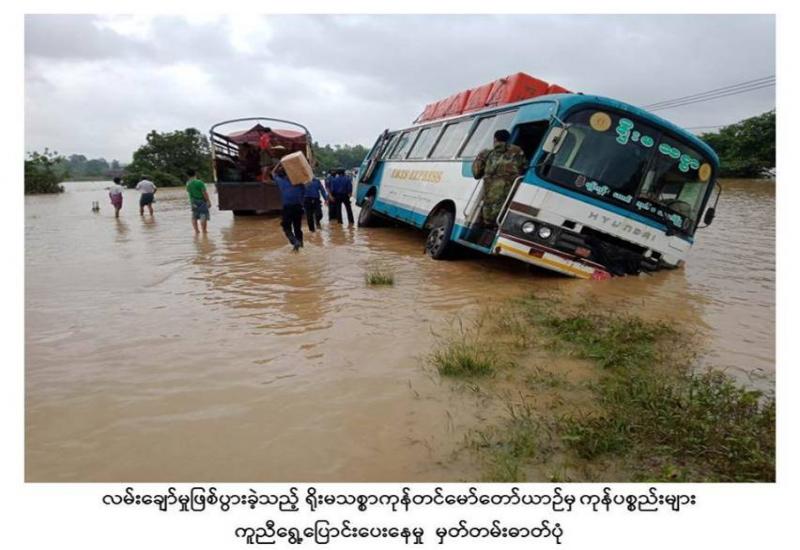 ရခိုင်ပြည်နယ်အတွင်း မိုးသည်းထန်စွာ ရွာသွန်းမှုကြောင့် သံတွဲ၊ ဘူးသီတောင်၊ မောင်တောမြို့နယ်များအတွင်း ရေကြီး၊ ရေလျှံမှုများဖြစ်ပေါ်ခဲ့သဖြင့် အနောက်ပိုင်းတိုင်း စစ်ဌာနချုပ်မှ နယ်မြေခံတပ်မတော်သားများ၊ မြန်မာနိုင်ငံရဲတပ်ဖွဲ့ဝင်များ၊ မီးသတ်တပ်ဖွဲ့ ဝင်များနှင့် ဌာနဆိုင်ရာတာဝန်ရှိသူများက ရေဘေးသင့်ပြည်သူများအား ကူညီကယ်ဆယ် ရေးလုပ်ငန်းများ စုပေါင်းဆောင်ရွက်ပေးလျက်ရှိသည်။