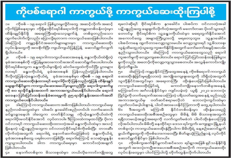 နိုင်ငံတော်စီမံအုပ်ချုပ်ရေးကောင်စီ၏ လမ်းညွန်မှုဖြင့် ကျန်းမာရေးနှင့်အားကစားဝန်ကြီးဌာန၊ ပြည်သူ့ကျန်းမာရေးနှင့်ကုသရေးဦးစီးဌာန က တရုတ်ပြည်သူ့သမ္မတနိုင်ငံမှ ရောက်ရှိလာသည့် ကိုဗစ်-၁၉ ရောဂါကာကွယ်ဆေး (၃)သန်းအား နေပြည်တော်ကောင်စီနယ်မြေ၊ တိုင်းဒေသကြီးနှင့် ပြည်နယ်အသီးသီးသို့ ဦးတည်အုပ်စုလူဦးရေနှင့် ဦးစားပေးအစီအစဉ်များနှင့်အညီ ပြည်သူများကို အမြန်ဆုံးထိုးနှံပေးနိုင်ရေးအတွက် သတ်မှတ်အအေးလမ်းကြောင်းစံချိန်စံညွန်းများအတိုင်း အချိန် နှင့်တစ်ပြေးညီ ဖြန့်ဖြူးပေးလျက်ရှိသည်။