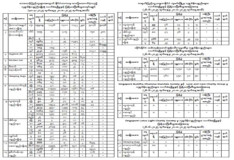 ၂၈-၃-၂၀၂၅ ရက်က လှုပ်ခတ်ခဲ့သော မန္တလေးမြေငလျင်ကြီးကြောင့် နေပြည်တော်ကောင်စီနယ်မြေ၊ စစ်ကိုင်းတိုင်းဒေသကြီး၊ မန္တလေးတိုင်းဒေသကြီး၊ မကွေးတိုင်းဒေသကြီး၊ ရှမ်းပြည်နယ်နှင့် ပဲခူးတိုင်းဒေသကြီးတို့တွင်ထိခိုက် ပျက်စီးမှုများဖြစ်ပေါ်ခဲ့ပြီး ငလျင်ဘေးသင့်ခဲ့သော ပြည်သူများအတွက် ပြည်တွင်း / ပြည်ပစေတနာရှင်၊ အလှူရှင်များ၏ လူသားချင်းစာနာထောက်ထားမှုဆိုင်ရာ အကူအညီပစ္စည်းများ၊ ဆေးဝါးများလှူဒါန်းထောက်ပံ့မှုနှင့် ဘေးသင့်ဒေသများသို့ ဖြန့်ခွဲထောက်ပံ့ဆောင်ရွက်မှုများကို သတင်းထုတ်ပြန်လျက်ရှိရာ ၂၀၂၅ ခုနှစ်၊ ဇွန်လ ၂၃ ရက်နေ့အထိ အခြေအနေကို ၂၅-၆-၂၀၂၅ ရက်နေ့တွင် ထုတ်ပြန်ခဲ့ပြီးဖြစ်ပါသည်။