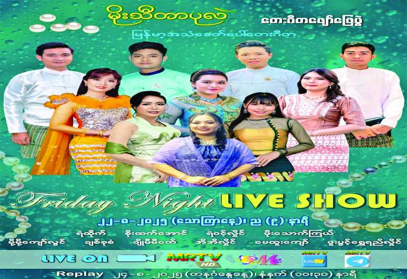 မြန်မာ့အသံနှင့်ရုပ်မြင်သံကြားအနေဖြင့် ပြည်သူများ အပန်းပြေစေရန်နှင့် စိတ်ခွန်အားသစ်များ ရရှိနိုင်ရန် ရည်ရွယ်ပြီး Friday Night Live Show တေးဂီတဖျော်ဖြေပွဲများကို ဆန်းသစ်တင်ဆက်လျက်ရှိရာ “မိုးသီတာပုလဲ” တေးဂီတဖျော်ဖြေပွဲကို ဩဂုတ် ၂၂ ရက် သောကြာနေ့ ည ၉ နာရီခန့်၌ မြန်မာ့အသံနှင့်ရုပ်မြင်သံကြား၏ MRTV-HD Channel နှင့် MRTV Entertainment Channel တို့မှ တိုက်ရိုက် (Live) ထုတ်လွှင့်ပြသမည်ဖြစ်သည်။