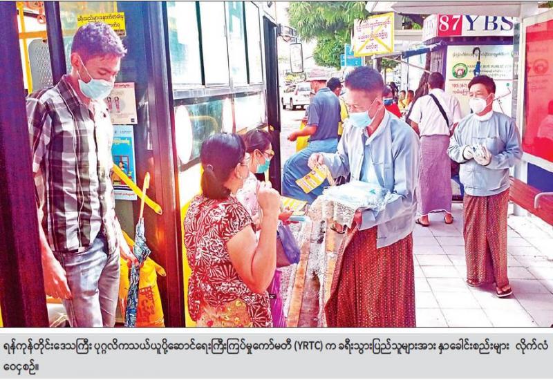 လတ်တလော ဖြစ်ပေါ်နေသော ကိုဗစ်-၁၉ ကပ်ရောဂါ တတိယလှိုင်းကာလ၌ ရန်ကုန်မြို့အတွင်း မဖြစ်မနေသွားလာလှုပ်ရှားနေသော ခရီးသွားပြည်သူများ ကိုဗစ်-၁၉ ကပ်ရောဂါပြန့်ပွားမှုကို ကာကွယ် ထိန်းချုပ်နိုင်ရေးအတွက် ရန်ကုန်တိုင်းဒေသကြီး ပုဂ္ဂလိကသယ်ယူ ပို့ဆောင်ရေးကြီးကြပ်မှုကော်မတီ(YRTC)က ပြည်သူများ ပူးပေါင်းပါဝင် လှူဒါန်းမှုနှင့်အတူ နှာခေါင်းစည်း စုစုပေါင်း နှစ်သိန်းခွဲကျော်ကို အခမဲ့ဖြန့်ဝေပေး မည်ဖြစ်ကြောင်း YRTC မှ သိရသည်။