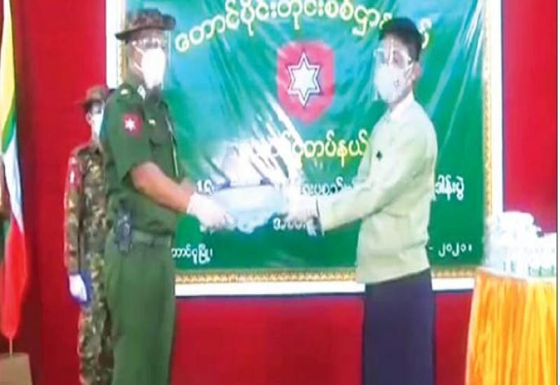 အသက်ရှူလမ်းကြောင်းဆိုင်ရာရောဂါ Coronavirus Disease 2019(COVID-19) ရောဂါကာကွယ်ရေး အထောက်အကူဖြစ်စေရန်အတွက် တောင်ငူခရိုင်စီမံအုပ် ချုပ်ရေးအဖွဲ့သို့ COVID-19 ရောဂါကာကွယ်ရေးပစ္စည်းများ ပေးအပ်လှူဒါန်းခြင်းကို ယနေ့နံနက်ပိုင်းတွင် ပဲခူးတိုင်းဒေသကြီး၊ တောင်ငူမြို့ရှိ ခရိုင်စီမံအုပ်ချုပ်ရေး အဖွဲ့ရုံး၌ ပြုလုပ်ရာ တောင်ပိုင်းတိုင်း စစ်ဌာနချုပ် ဒုတိယတိုင်းမှူး ဗိုလ်မှူးချုပ် အောင်ခိုင်ချိုနှင့် အဖွဲ့ဝင်များ၊ ခရိုင်စီမံ အုပ်ချုပ်ရေးအဖွဲ့ရုံးမှ တာဝန်ရှိသူများနှင့် ဌာနဆိုင်ရာဝန်ထမ်းများ တက်ရောက်ကြသည်။