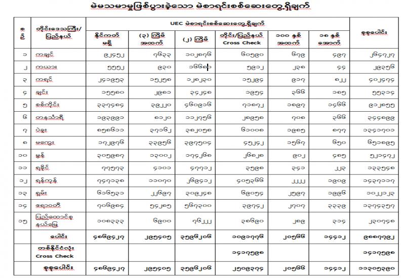 ၁။ ပြည်ထောင်စုရွေးကောက်ပွဲကော်မရှင်သည် ၂၀၂၀ ပြည့်နှစ် နိုဝင်ဘာလ ၈ ရက်နေ့တွင် ကျင်းပပြုလုပ်သည့် ပါတီစုံဒီမိုကရေစီအထွေထွေရွေးကောက်ပွဲနှင့်စပ်လျဉ်း၍ ရွေးကောက်ပွဲ ကျင်းပ ခဲ့သည့် မြို့နယ် ၃၁၅ မြို့နယ်၏ မဲဆန္ဒရှင်စာရင်းစိစစ်တွေ့ချက်များနှင့် ပြည်သူ့လွှတ်တော် ဆန္ဒမဲ လက်မှတ်များ မြေပြင်ဖွင့်ဖောက်စစ်ဆေးခဲ့မှုအခြေအနေ မြို့နယ်အလိုက် စိစစ်တွေ့ရှိမှုစာရင်းများ၊ တိုင်းဒေသကြီး/ ပြည်နယ်နှင့် ပြည်ထောင်စုနယ်မြေ တစ်ခုချင်းအလိုက် စိစစ်တွေ့ရှိမှု စာရင်းချုပ် များကို ၁၆- ၂- ၂၀၂၁ ရက်နေ့မှ ၇- ၇- ၂၀၂၁ ရက်နေ့အထိ စိစစ်ထုတ်ပြန်ခဲ့ပြီးဖြစ်ပါသည်။