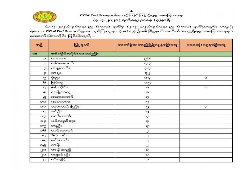 (၁-၇-၂၀၂၁)ရက်နေ့၊ ည (၈:၀၀) နာရီမှ (၂-၇-၂၀၂၁)ရက်နေ့၊ ည (၈:၀၀) နာရီအတွင်း တွေ့ရှိ ရသော COVID-19 ဓာတ်ခွဲအတည်ပြုလူနာ (၁၈၆၃) ဦး၏ မြို့နယ်အလိုက် တွေ့ရှိရမှု အခြေအနေမှာ အောက်ပါအတိုင်း ဖြစ်ပါသည် -