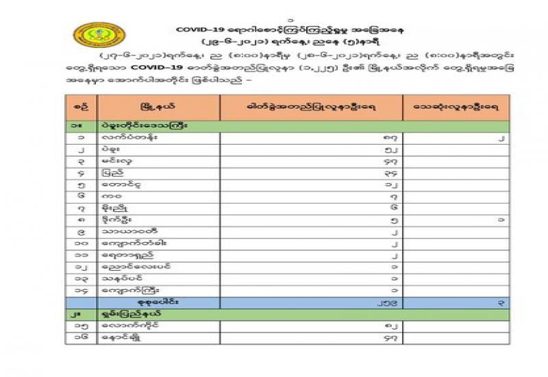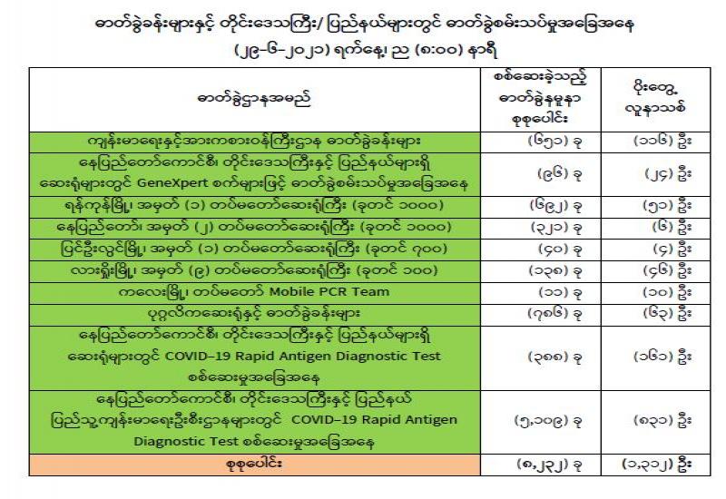 (၂၈-၆-၂၀၂၁) ရက်နေ့၊ ည (၈:၀၀) နာရီမှ (၂၉-၆-၂၀၂၁) ရက်နေ့၊ ည (၈:၀၀) နာရီအတွင်း ဓာတ်ခွဲ နမူနာ စုစုပေါင်း (၈,၂၃၂)ခုအား စစ်ဆေးပြီးစီးခဲ့ရာ COVID-19 ရောဂါ ဓာတ်ခွဲအတည်ပြု လူနာသစ် (၁,၃၁၂) ဦး တွေ့ရှိရပါသည်။ သို့ဖြစ်ပါ၍ ယနေ့အထိ ဓာတ်ခွဲနမူနာ စုစုပေါင်း (၂,၇၂၆,၄၀၂) ခု အား စစ်ဆေးခဲ့ပြီး COVID-19 ဓာတ်ခွဲအတည်ပြုလူနာ စုစုပေါင်း (၁၅၅,၆၉၇) ဦး ရှိပြီ ဖြစ်ပါသည်။