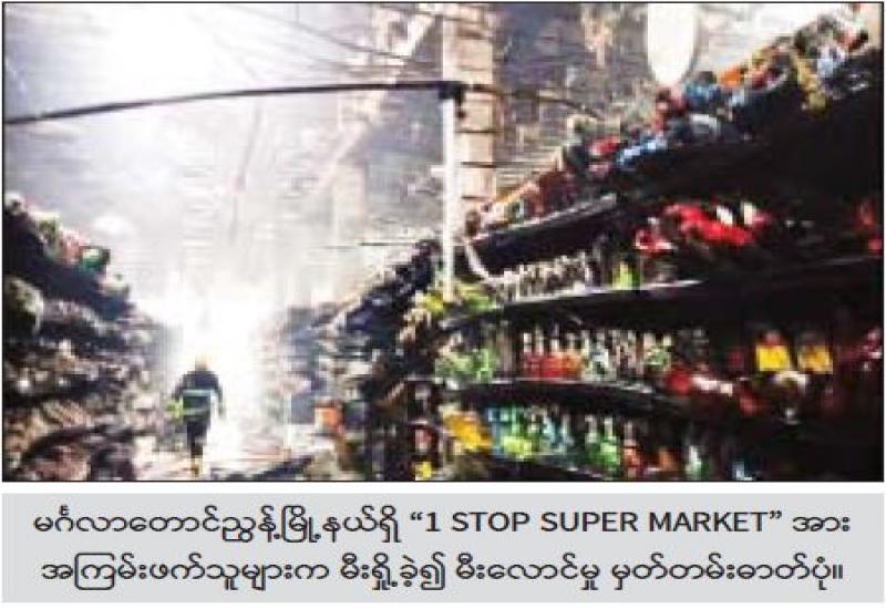 ရန်ကုန်တိုင်းဒေသကြီး၊ ဗဟန်းမြို့နယ်၊ မင်္ဂလာတောင်ညွှန့်မြို့နယ်၊ ကျောက်တံတားမြို့နယ် များတွင် ဖွင့်လှစ်ထားရှိသော “1 STOP SUPER MARKET” ဆိုင်များအား အကြမ်းဖက်သူများက မီးရှို့ ဖျက်ဆီးမှုများ ပြုလုပ်ခဲ့ကြောင်း သိရသည်။