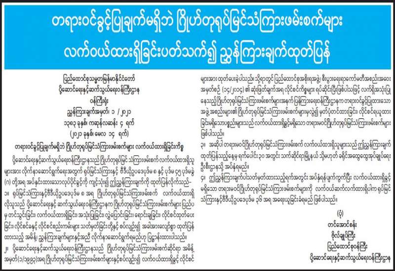 ပြန်ကြားရေးဝန်ကြီးဌာနက တာဝန်ယူစီမံခန့်ခွဲလျက်ရှိသော မန္တလေးမြို့ရှိ နိုင်ငံပိုင် ရုပ်ရှင်ရုံ လေးရုံနှင့် ပတ်သက်၍ တာဝန်နှင့်ဝတ္တရားများ လွှဲပြောင်းသည့်စာချုပ် (Deed of Assignment) ချုပ်ဆိုခြင်း အခမ်းအနားကို ယနေ့ညနေ ၅နာရီခွဲက မန္တလေးတိုင်းဒေသကြီး စီမံအုပ်ချုပ်ရေး ကောင်စီရုံး အစည်းအဝေး ခန်းမ၌ ကျင်းပသည်။