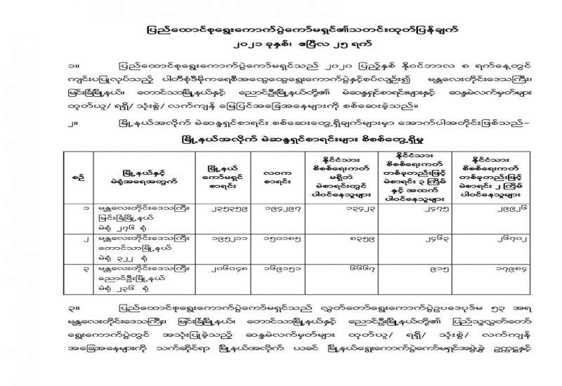 ငါးမွေးမြူရေးတိုးချဲ့ဆောင်ရွက်ရန် နှစ်လက်မအရွယ် ငါးသားပေါက်များ မြစ်ချောင်း၊ အင်းအိုင်များတွင် တိုးချဲ့ထည့်သွင်းမွေးမြူရန် ငါးသားပေါက်များ တိုးတက်ထုတ်လုပ်ရေး ကြိုးပမ်းဆောင်ရွက်ကြရန် နှင့် မွေးမြူထုတ်လုပ်သော ငါးများကို ဥရောပ (၂၆) နိုင်ငံမှ ဝယ်ယူစားသုံးလျက်ရှိသဖြင့် ပြည်ပဝင်ငွေ တိုးတက်ရရှိရေးအတွက် ကောင်းမွန်သော မွေးမြူ ရေးကျင့်စဉ် (GAqP)ဖြင့် မွေးမြူသော ငါးကန်များ ပိုမိုများပြားလာစေရန် စည်းရုံးဆောင်ရွက်ကြရန် လိုကြောင်း စိုက်ပျိုးရေး၊ မွေးမြူရေးနှင့် ဆည်မြောင်း ဝန်ကြီးဌာန ဒုတိယဝန်ကြီး ဒေါက်တာအောင်ကြီး က ယနေ့နံနက်ပိုင်းတွင် နေပြည်တော် ပျဉ်းမနား မြို့နယ် ရေဆင်းငါးလုပ်ငန်းစခန်းသို့ သွားရောက် စစ်ဆေးစဉ် ပြောကြားသည်။