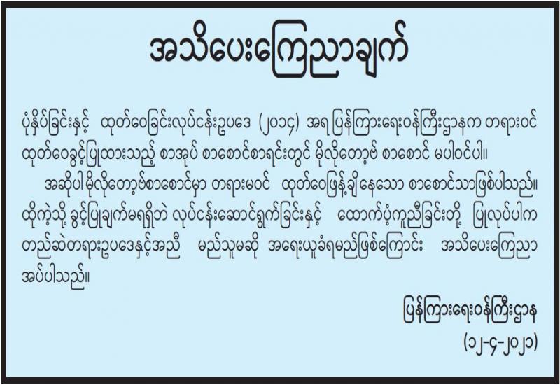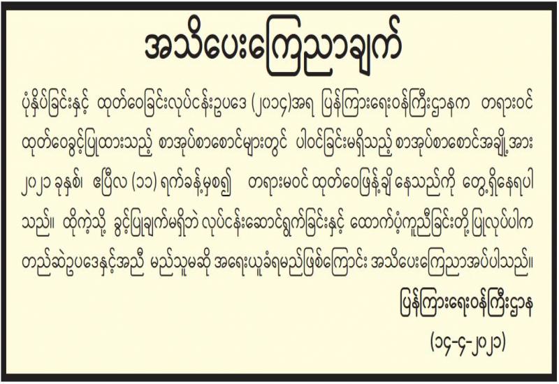 မြန်မာနိုင်ငံ သတင်းမီဒီယာကောင်စီ အစည်းအဝေးကို ယနေ့မွန်းလွဲ ၁ နာရီတွင် ရန်ကုန်မြို့ ဗိုလ်တထောင်မြို့နယ် ကုန်သည်လမ်း အမှတ်(၃၉၂/၃၉၆)ရှိ မြန်မာနိုင်ငံ သတင်း မီဒီယာကောင်စီရုံး အစည်းအဝေးခန်းမ၌ ကျင်းပသည်။