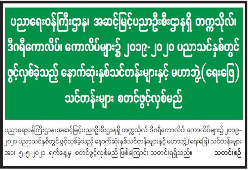 သယံဇာတနှင့် သဘာဝပတ်ဝန်းကျင်ထိန်းသိမ်းရေး ဝန်ကြီးဌာန (သတ္တုရေးရာ) ရုံးအမှတ် (၁၉) နေပြည်တော် တိုးချဲ့ရုံးအဆောက်အဦသစ် ကဗ္ဗည်းမော်ကွန်း ဖွင့်ပွဲအခမ်းအနားကို ယနေ့နံနက် ၁၁ နာရီတွင် အဆိုပါ အဆောက်အဦသစ်၌ ကျင်းပသည်။