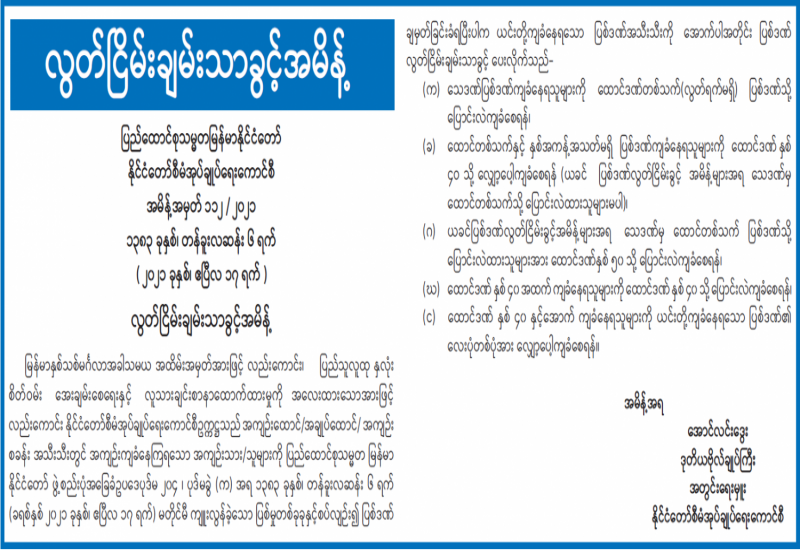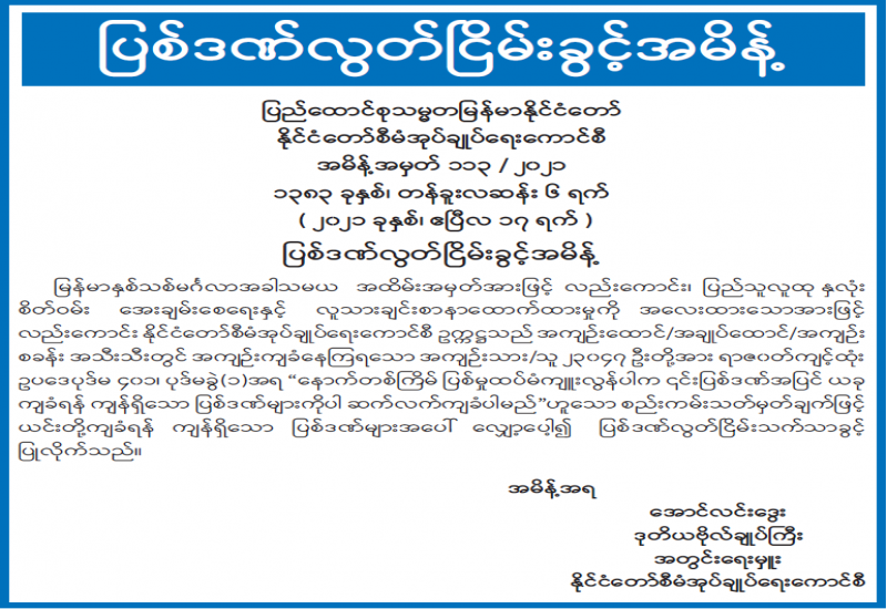 ပြည်ထောင်စုသမ္မတမြန်မာနိုင်ငံတော်သည် မြန်မာနှစ်သစ်မင်္ဂလာအခါသမယအထိမ်းအမှတ်အား ဖြင့် လည်းကောင်း ၊ အေးချမ်းသာယာပြီး ခေတ်မီဖွံ့ဖြိုးတိုးတက်သော စည်းကမ်းပြည့်ဝသည့် ဒီမိုက ရေစီ နိုင်ငံ တော်သစ်တည်ဆောက်နေချိန်တွင် ပြစ်ဒဏ်ကျ အကျဉ်းသား၊ အကျဉ်းသူများမှလည်း တစ်ဖက် တစ်လမ်းမှ အကျိုးပြုစေမည့် နိုင်ငံသားများအဖြစ်သို့ ပြောင်းလဲပေးရန်အတွက်လည်းကောင်း၊ ပြည်သူ လူထု နှလုံးစိတ်ဝမ်းအေးချမ်းစေရေးနှင့် လူသားချင်းစာနာထောက်ထားမှုကို အလေးထားသော အားဖြင့် လည်းကောင်း၊ နိုင်ငံအချင်းချင်း မိတ်ဝတ်မပျက်ဆက်ဆံရေးကို ရှေးရှုသောအားဖြင့် လည်း ကောင်း၊ နိုင်ငံတော် စီမံအုပ်ချုပ်ရေးကောင်စီဉက္ကဌ က အမိန့်အမှတ် ၁၁၃/၂၀၂၁ နှင့် ၁၁၄/၂၀၂၁ တို့ဖြင့် အကျဉ်းထောင်၊ အချုပ်ထောင်၊ စခန်းအသီးသီးတို့တွင် အကျဉ်းကျခံနေကြရသော အကျဉ်းသား၊ အကျဉ်းသူ နိုင်ငံသား ၂၃၀၄၇ ဦးနှင့် နိုင်ငံခြားသား အကျဉ်းသား၊အကျဉ်းသူ ၁၃၇ ဦး၊ စုစုပေါင်း ၂၃၁၈၄ ဦးတို့ကို ယနေ့တွင် ပြစ်ဒဏ်လွတ်ငြိမ်းသက်သာခွင့် ပြုခဲ့ကြောင်းသိရသည်။