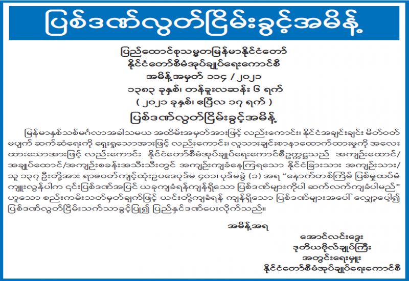 ပြည်ထဲရေးဝန်ကြီးဌာနမိသားစု၏ ဇီဝိတဒါန ငါးလွှတ်ပွဲအခမ်းအနားကို ယနေ့မွန်းလွဲ ၁ နာရီခွဲတွင် နေပြည်တော် ဇမ္ဗူသီရိမြို့နယ် ဘောဂသိဒ္ဓိ ရပ်ကွက် ပျဉ်းမနား- တောင်ညိုလမ်းမဘေးရှိ မင်္ဂလာ ကန်တော်၌ ကျင်းပသည်။