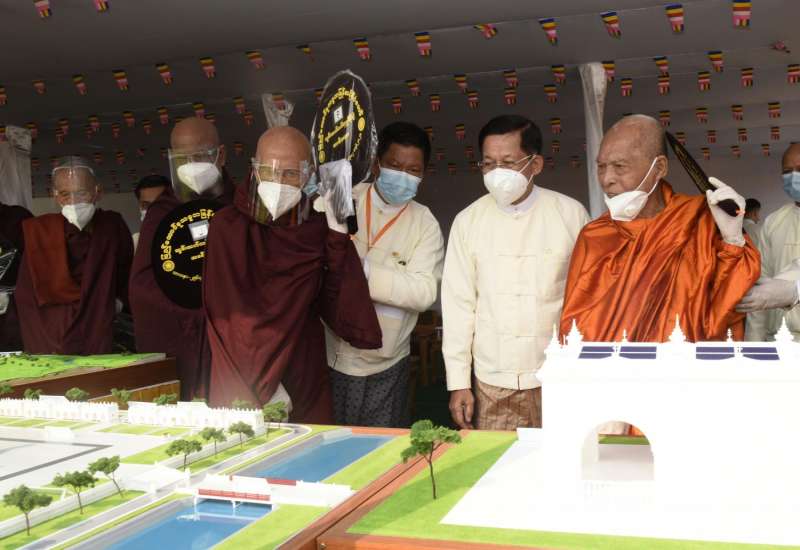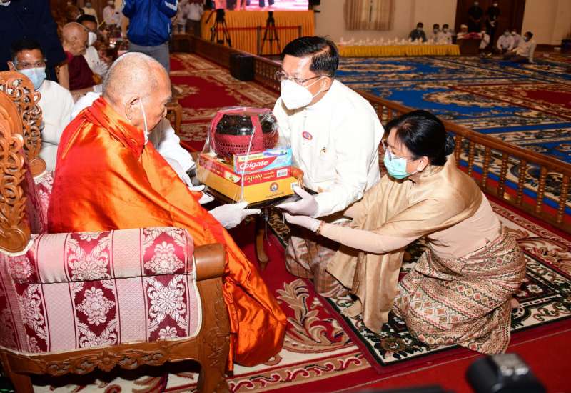 ၂၀၂၁ ခုနှစ်၊ သာသနာတော်ဆိုင်ရာ ဘွဲ့တံဆိပ်တော်ဆက်ကပ်ခံယူမည့် ဆရာတော် များအား ပြည်ထောင်စုသမ္မတမြန်မာနိုင်ငံတော်၊ နိုင်ငံတော်စီမံအုပ်ချုပ်ရေးကောင်စီ ဥက္ကဋ္ဌ တပ်မတော်ကာကွယ်ရေးဦးစီးချုပ် ဗိုလ်ချုပ်မှူးကြီး မင်းအောင်လှိုင်နှင့်ဇနီး ဒေါ်ကြူကြူလှ တို့က ယနေ့နံနက်ပိုင်းတွင် နေပြည်တော်၊ ဥပ္ပါတသန္တိစေတီတော်မြတ်ကြီး ပရိဝုဏ်အတွင်း ရှိ သာသနာ့မဟာဗိမာန်တော်ကြီး၌ နေ့ဆွမ်းဆက်ကပ်လှူဒါန်းသည်။