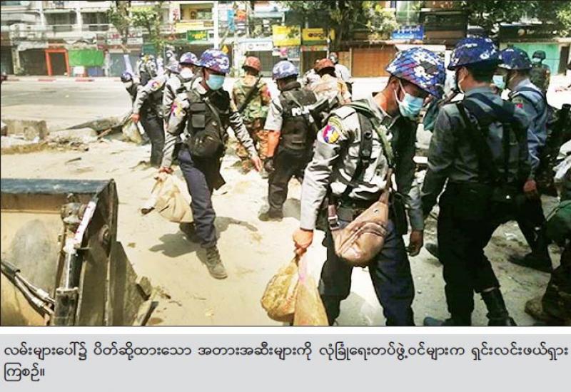 ရန်ကုန်တိုင်းဒေသကြီး လှိုင်မြို့နယ်တွင် လုံခြုံရေး တပ်ဖွဲ့ဝင်များက ဆူပူအကြမ်းဖက်သူများ တားဆီး ပိတ်ဆို့ထားသော အတားအဆီးများကို ရှင်းလင်းဖယ်ရှားခဲ့ကြောင်း မြန်မာနိုင်ငံရဲတပ်ဖွဲ့၏ သတင်းထုတ်ပြန်ချက်အရ သိရသည်။