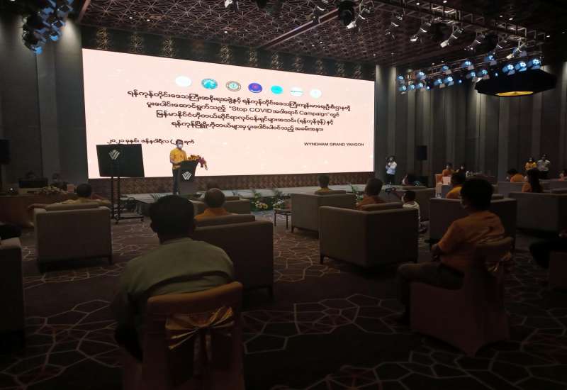 ရန်ကုန်အရှေ့ပိုင်းခရိုင်၊ မင်္ဂလာတောင်ညွန့်မြို့နယ်၊ WYNDHAM GRAND YANGON HOTEL တွင် ယနေ့ နံနက် ၈ နာရီက ကျင်းပပြုလုပ်ခဲ့သည့် ရန်ကုန်တိုင်းဒေသကြီးအစိုးရအဖွဲ့နှင့် ရန်ကုန်တိုင်း ဒေသကြီး ကျန်းမာရေးဦးစီးဌာနတို့ ပူးပေါင်းဆောင်ရွက်သည့် “Stop COVID အဝါရောင် Campaign” တွင် မြန်မာနိုင်ငံ ဟိုတယ်ဆိုင်ရာ လုပ်ငန်းရှင်များအသင်း (ရန်ကုန်ဇုန်) နှင့် ရန်ကုန်မြို့ရှိ ဟိုတယ်များမှ ပူးပေါင်းပါဝင်သည့် အခမ်းအနားသို့ ရန်ကုန်တိုင်းဒေသကြီး အစိုးရအဖွဲ့ ဝန်ကြီးချုပ် ဦးဖြိုးမင်းသိန်းနှင့် အစိုးရအဖွဲ့ဝင် ဝန်ကြီးများနှင့် ရန်ကုန်တိုင်းဒေသကြီး ပြည်သူ့ကျန်းမာရေးနှင့် ကုသ‌‌ရေးဦးစီးဌာနမှူး ဒုတိယညွှန်ကြားရေးမှူးချုပ်နှင့် အဖွဲ့ဝင်များ တက်ရောက်ခဲ့ကြောင်း သိရ သည်။