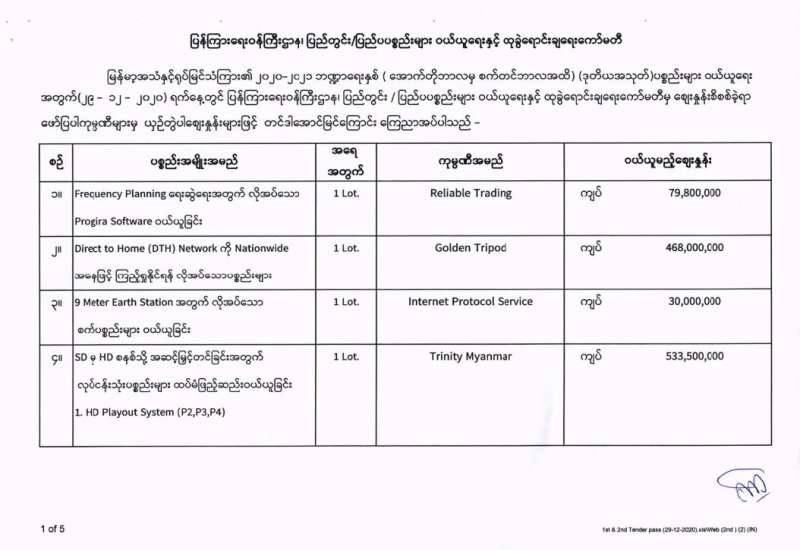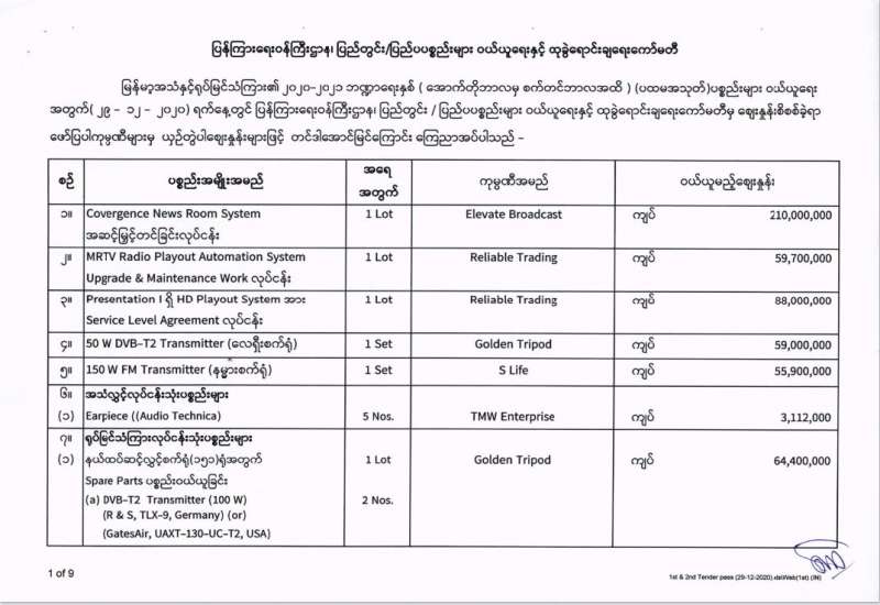 မြန်မာ့အသံနှင့်ရုပ်မြင်သံကြား၏ ၂၀၂၀-၂၀၂၁ ဘဏ္ဍာရေးနှစ် (အောက်တိုဘာလမှ စက်တင်ဘာလအထိ) (ပထမအသုတ်) ပစ္စည်းများ ဝယ်ယူရေးအတွက် (၂၉-၁၂-၂၀၂၀) ရက်နေ့တွင် ပြန်ကြားရေးဝန်ကြီးဌာန၊ ပြည်တွင်း/ပြည်ပ ပစ္စည်းများ ဝယ်ယူရေးနှင့် ထုခွဲရောင်းချရေး ကော်မတီမှ ဈေးနှုန်းစိစစ်ခဲ့ရာ ဖော်ပြပါကုမ္ပဏီများမှ ယှဉ်တွဲပါ ဈေးနှုန်းများဖြင့် တင်ဒါအောင်မြင်ကြောင်း ကြေညာအပ်ပါသည်