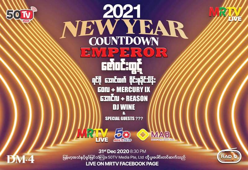 ပြန်ကြားရေးဝန်ကြီးဌာန မြန်မာ့အသံနှင့်ရုပ်မြင်သံကြားနှင့် 50 TV Media Pte,Ltd တို့ ပူးပေါင်းတင်ဆက်မည့် နိုင်ငံတကာ နှစ်သစ်ကူးနေ့ဖျော်ဖြေပွဲ (New Year Countdown Music Concert) အစီအစဉ်ကို ဒီဇင်ဘာ ၃၁ ရက် ကြာသပတေးနေ့ မြန်မာ့ရုပ်မြင်သံကြား၏ ည ၈ နာရီသတင်း အစီအစဉ် အပြီးတွင် အထူးအစီအစဉ်အဖြစ် Emperor တေးဂီတအဖွဲ့နှင့် MERCURY IX, DJ Wine တေးဂီတအဖွဲ့တို့၏ တီးခတ်မှုဖြင့် နိုင်ငံကျော် တေးသံရှင် များဖြစ်ကြသည့် ဇော်ဝင်းထွဋ်၊ ရင်ဂို၊ အောင်ထက်၊ ဝိုင်းစုခိုင်သိန်း၊ ဝေလနှင့် MERCURY IX၊ အောင်လ + REASON ဧည့်သည်တော် တေးသံရှင်များက ရန်ကုန်မြို့ ဒဂုံမြို့သစ်မြောက်ပိုင်းမြို့နယ်ရှိ 50 TV Live Studio မှ စင်တင် တေးဂီတနှင့် ဖျော်ဖြေတင်ဆက်မည် ဖြစ်ပါသည်။