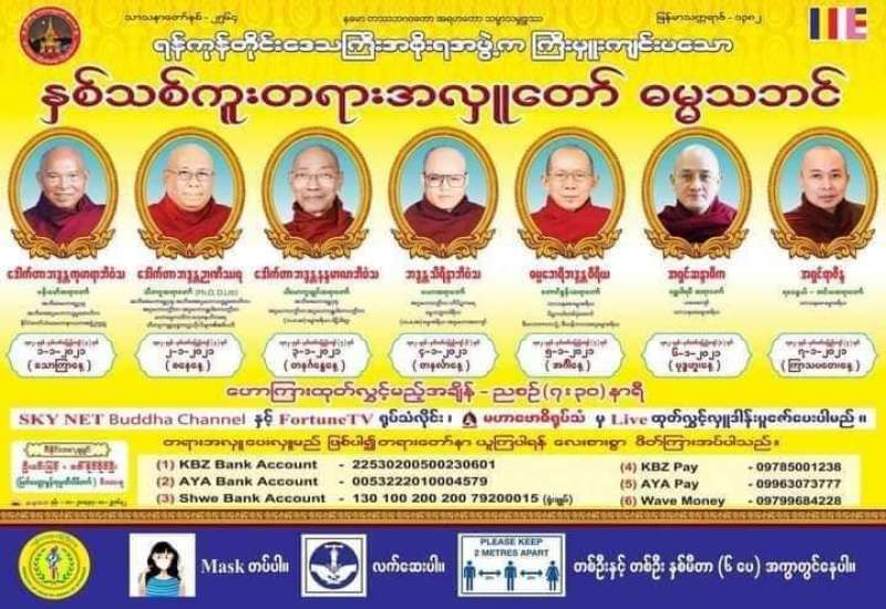 ရန်ကုန်တိုင်းဒေသကြီးအစိုးရအဖွဲ့ က ကြီးမှူးကျင်းပမည့် နှစ်သစ်ကူးတရားတော်အား ရုပ်သံလိုင်းများမှ ထုတ်လွှင့်ပြသမည်ဖြစ်ကြောင်း ဒီဇင်ဘာ ၂၃ ရက် က ကျင်းပရေးကော်မတီထံမှ သိရသည်။