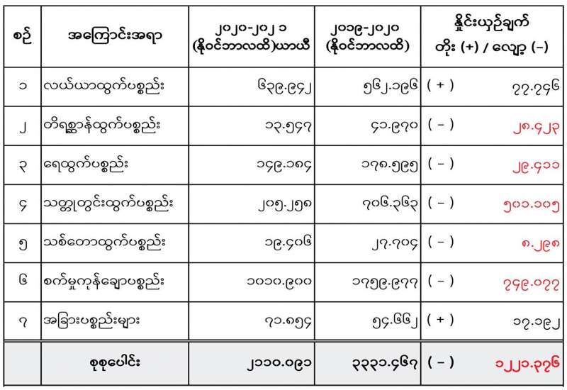 ၂၀၂၀-၂၀၂၁ ဘဏ္ဍာနှစ်(နိုဝင်ဘာလထိ)တွင် မြန်မာနိုင်ငံ၏ ပြည်ပကုန်သွယ်မှု (ယာယီစာရင်းအရ) ကုန်သွယ်မှုပမာဏ အမေရိကန်ဒေါ်လာ ၄၄၆၈ သန်းတွင် ပြည်ပပို့ကုန် တန်ဖိုးမှာ အမေရိကန်ဒေါ်လာ ၂၁၁၀ သန်းနှင့် ပြည်ပသွင်းကုန်တန်ဖိုး အမေရိကန်ဒေါ်လာ ၂၃၅၈ သန်း ဖြစ်ပါသည်။ ၂၀၁၉-၂၀၂၀ ဘဏ္ဍာနှစ် ကာလတူတွင် ပြည်ပ ပို့ကုန်တန်ဖိုး အမေရိကန်ဒေါ်လာ ၃၃၃၁ သန်း၊ ပြည်ပသွင်းကုန်တန်ဖိုး အမေရိကန်ဒေါ်လာ ၃၀၉၈ သန်းဖြစ်၍ ပြည်ပကုန်သွယ်မှုပမာဏ အမေရိကန်ဒေါ်လာ ၆၄၂၉ သန်း ဖြစ်သဖြင့် ယခင်ဘဏ္ဍာနှစ်ထက် ပို့ကုန် ၁၂၂၁ ဒေါ်လာသန်း၊ သွင်းကုန် ၇၄၀ ဒေါ်လာသန်းနှင့် ကုန်သွယ်မှုပမာဏ အမေရိကန်ဒေါ်လာ ၁၉၆၁ သန်း လျော့နည်းခဲ့ပါသည်။
