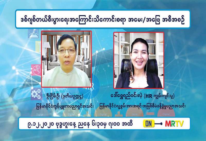 COVID-19 ရောဂါဖြစ်ပွားမှု ကာလအတွင်း စီးပွားရေးလုပ်ငန်းများ ပြန်လည် လုပ်ကိုင်လည်ပတ်နိုင်ရန် ရည်ရွယ်ချက်ဖြင့် ပြည်သူကို ပညာပေးမျှဝေပေးမည့် “ဒစ်ဂျစ်တယ်စီးပွားရေးအကြောင်းသိကောင်းစရာ အမေး/အဖြေ အစီအစဉ်” ကို နိုဝင်ဘာ၂၅ရက်မှစ၍ အပတ်စဉ်ဗုဒ္ဓဟူးနှင့် ကြာသပတေးနေ့များတွင် ညနေ ၆ နာရီ မိနစ် ၃၀ မှ ည ၇ နာရီအထိ မြန်မာ့အသံနှင့် ရုပ်မြင်သံကြားတွင် ထုတ်လွှင့်ပြသလျက်ရှိသည်။