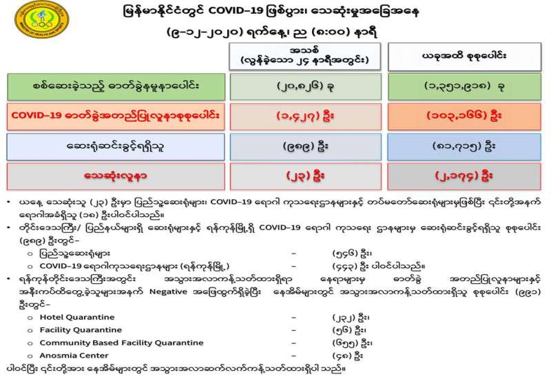 (၈-၁၂-၂၀၂၀) ရက်နေ့၊ ည (၈:၀၀) နာရီမှ (၉-၁၂-၂၀၂၀) ရက်နေ့၊ ည (၈:၀၀) နာရီ အတွင်း ဓာတ်ခွဲနမူနာ စုစုပေါင်း (၂၀,၈၂၆) ခုအား စစ်ဆေးပြီးစီးခဲ့ရာ COVID-19 ရောဂါ ဓာတ်ခွဲအတည်ပြု လူနာသစ် (၁,၄၂၇) ဦး တွေ့ရှိရပါသည်။