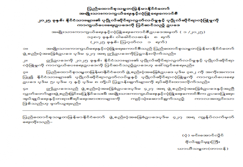 နိုင်ငံသားတိုင်းသည် ပြည်ထောင်စုမပြိုကွဲရေး၊ တိုင်းရင်းသားစည်းလုံးညီညွတ်မှုမပြိုကွဲရေးနှင့် အချုပ်အခြာအာဏာတည်တံ့ခိုင်မြဲရေးဟူသည့် ဒို့တာဝန်အရေးသုံးပါးကို စောင့်ထိန်းရန်တာဝန်ရှိသဖြင့် ယင်းတာဝန်များကို ထမ်းဆောင်နိုင်ရန်အတွက် နိုင်ငံသားတိုင်းစစ်ပညာသင်ကြားရန်နှင့် နိုင်ငံတော်ကာကွယ်ရေးအတွက် စစ်မှုထမ်းဆောင်နိုင်ရန် ပြည်သူ့စစ်မှုထမ်းဥပဒေကို ၂၀၂၄ ခုနှစ်၊ ဖေဖော်ဝါရီလ ၁၀ ရက်တွင် စတင်အာဏာတည်ခဲ့ပြီး နိုင်ငံတော်ကာကွယ်ရေးနှင့် လုံခြုံရေးတာဝန်များကို ထမ်းဆောင်ရန် စိတ်အားထက်သန်စွာ လာရောက်စာရင်းပေးသွင်းကြသည့် လူငယ်များကို ပြည်သူ့စစ်မှုထမ်းသင်တန်းများ ဖွင့်လှစ်သင်ကြားပေးလျက်ရှိသည်။