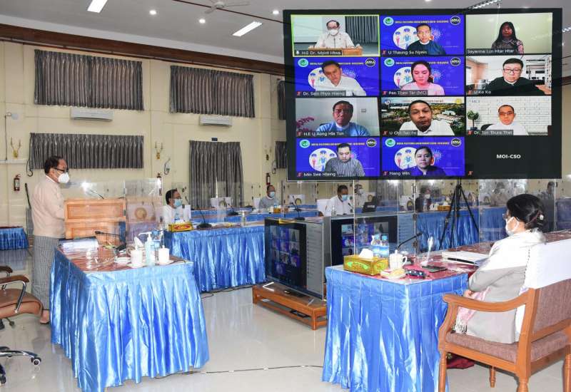 တိုင်းဒေသကြီး/ ပြည်နယ်များတွင် ကိုဗစ်-၁၉ ဖြစ်ပွားကူးစက်မှု အခြေအနေနှင့် တစ်ပြည်လုံး အတိုင်းအတာဖြင့် ရောဂါဖြစ်ပွားမှုများသော မြို့နယ်များ အားလုံး၌ ဆောင်ရွက်နေသော ပါးစပ်နှင့် နှာခေါင်းစည်း မဖြစ်မနေတပ်ဆင်ရေး လူထုလှုပ်ရှား စီမံချက် ဆောင်ရွက်နေမှုများအား အသေးစိတ် တင်ပြဆွေးနွေးခြင်း အစည်းအဝေးကို ယမန်နေ့ က ဗီဒီယိုကွန်ဖရင့် စနစ်ဖြင့် ကျင်းပရာ ကျန်းမာရေးနှင့်အားကစားဝန်ကြီးဌာန၊ ပြည်ထောင်စုဝန်ကြီး ဒေါက်တာမြင့်ထွေး တက်ရောက် အမှာစကားပြောကြားသည်။