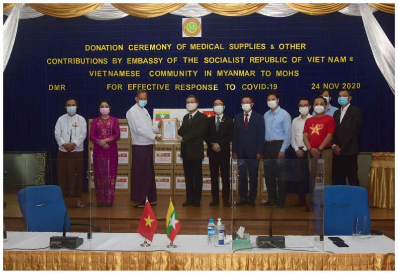 ကျန်းမာရေးနှင့် အားကစားဝန်ကြီးဌာနသို့ မြန်မာနိုင်ငံဆိုင်ရာ ဗီယက်နမ်နိုင်ငံသံရုံးနှင့် မြန်မာနိုင်ငံအခြေစိုက် ဗီယက်နမ်နိုင်ငံ စီးပွားရေးလုပ်ငန်းရှင်များက အလှူငွေ၊ Masks၊ Thermo meters နှင့် လက်သန့်ဆေးရည်ဘူးများ ပေးအပ်လှူဒါန်းပွဲ အခမ်းအနားကို ယနေ့ မွန်းလွဲ ၃ နာရီက ရန်ကုန်မြို့ ဒဂုံမြို့နယ် ဇီဝကလမ်း အမှတ်(၅)ရှိ ဆေးသုတေသနဦးစီးဌာန(ရုံးချုပ်) အစည်းအဝေးခန်းမ၌ ပြုလုပ်သည်။