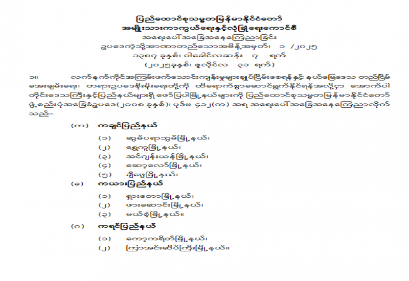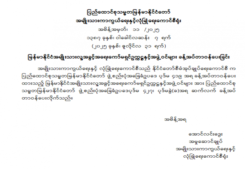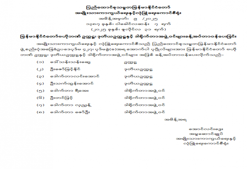 မြန်မာနိုင်ငံအမျိုးသားလူ့အခွင့်အရေးကော်မရှင်ဥက္ကဋ္ဌနှင့် အဖွဲ့ဝင်များ ခန့်အပ်တာဝန်ပေးခြင်း