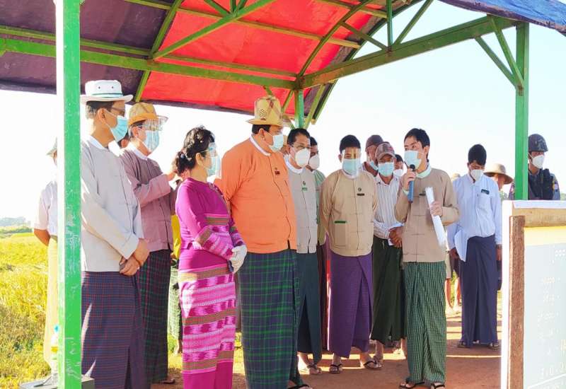 ဧရာဝတီတိုင်းဒေသကြီး ဝန်ကြီးချုပ် ဦးလှမိုးအောင်သည် တိုင်းဒေသကြီး အစိုးရအဖွဲ့ဝင်ဝန်ကြီးများ၊ တိုင်းဒေသကြီး အစိုးရအဖွဲ့ အတွင်းရေးမှူး၊ တိုင်းဒေသကြီး၊ ခရိုင်၊ မြို့နယ်အဆင့် ဌာနဆိုင်ရာများမှ တာဝန်ရှိသူများ လိုက်ပါလျက် ယနေ့ နံနက် ၈ နာရီခွဲအချိန်က ကန်ကြီးထောင့်မြို့နယ်၊ ဝါးဒူးကျေးရွာအုပ်စု၊ ဝါးဒူးကျေးရွာ၊ ကွင်းအမှတ် (၁၅၃-စီ)၊ ဦးပိုင်အမှတ် (၂၈/၆) တောင်သူ ဦးနေစိုး၏ လယ်မြေတွင် ကျင်းပပြုလုပ်သော ၂၀၂၀ ပြည့်နှစ် မိုးစပါးစံကွက် ရိတ်သိမ်းပွဲ အခမ်းအနားသို့ တက်ရောက် ကြည့်ရှု အားပေးပြီး ဒေသခံတောင်သူများနှင့် တွေ့ဆုံခဲ့သည်။