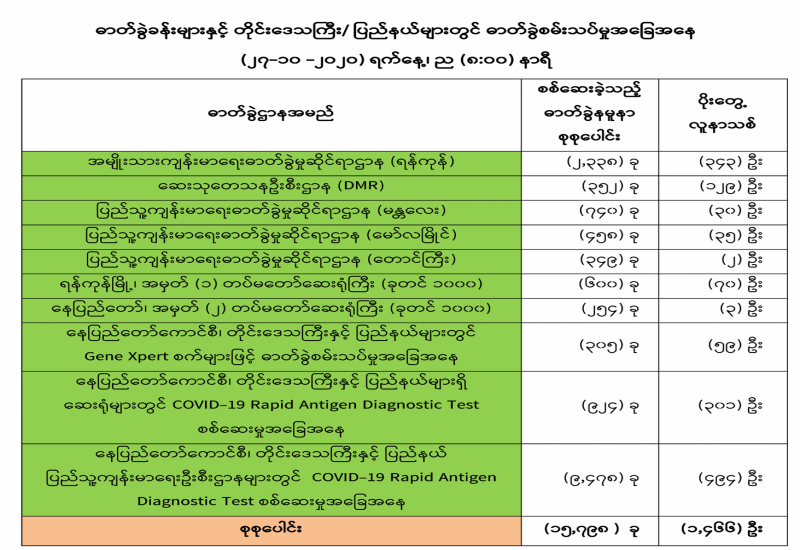 (၂၅-၁၀-၂၀၂၀) ရက်နေ့၊ ည (၈:၀၀) နာရီမှ (၂၆-၁၀-၂၀၂၀) ရက်နေ့၊ ည (၈:၀၀) နာရီ အတွင်း ဓာတ်ခွဲနမူနာ စုစုပေါင်း (၁၂,၄၀၀) ခုအား စစ်ဆေးပြီးစီးခဲ့ရာ COVID-19 ရောဂါ ဓာတ်ခွဲ အတည်ပြု လူနာသစ် (၁,၄၂၆)ဦး တွေ့ရှိရပါသည်။