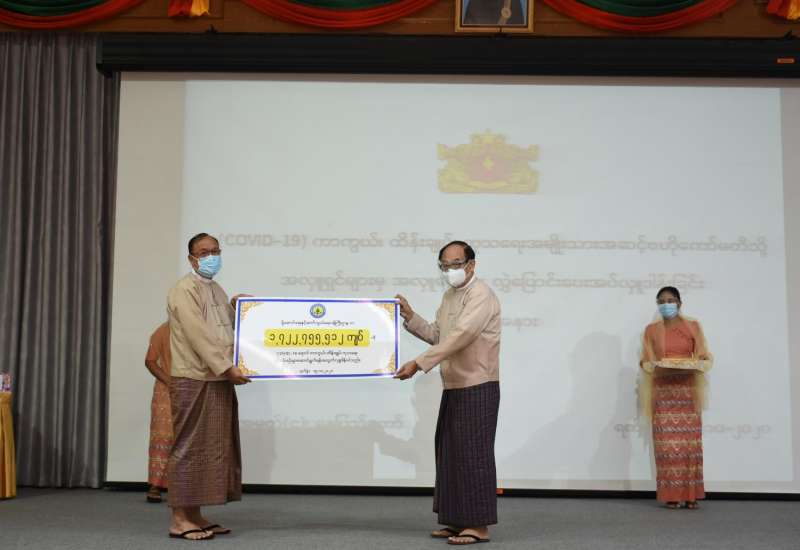Coronavirus Disease 2019 (COVID-19) ကာကွယ်၊ ထိန်းချုပ်၊ ကုသရေး အမျိုးသားအဆင့် ဗဟိုကော်မတီသို့ အလှူငွေ ပေးအပ်ပွဲကို ယနေ့မွန်းလွဲပိုင်းတွင် နေပြည်တော်ရှိ ကျန်းမာရေးနှင့် အားကစား ဝန်ကြီးဌာန၌ ကျင်းပရာ Coronavirus Disease 2019 (COVID-19) ကာကွယ်၊ ထိန်းချုပ်၊ ကုသရေး အမျိုးသားအဆင့်ဗဟိုကော်မတီ အတွင်းရေးမှူး ပြည်ထောင်စုဝန်ကြီး ဒေါက်တာမြင့်ထွေးက လက်ခံသည်။