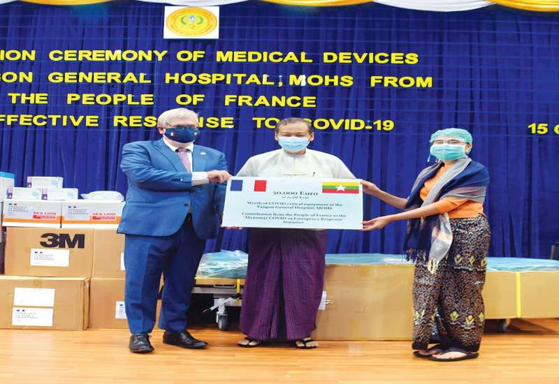 ရန်ကုန်ပြည်သူ့ဆေးရုံကြီးသို့ ပြင်သစ်နိုင်ငံမှ ကိုဗစ် - ၁၉ ရောဂါ ကုသရေးတွင် အသုံးပြုရန်အတွက် ဆေးပစ္စည်းကိရိယာများ ပေးအပ်လှူဒါန်းပွဲအခမ်းအနားကို ယနေ့ မွန်းလွဲ ၂ နာရီခွဲက ရန်ကုန်မြို့ ဒဂုံမြို့နယ် ဇီဝကလမ်း အမှတ် (၅) ရှိ ဆေးသုတေသနဦးစီးဌာန (ရုံးချုပ်) အစည်းအဝေးခန်းမ၌ ပြုလုပ်သည်။