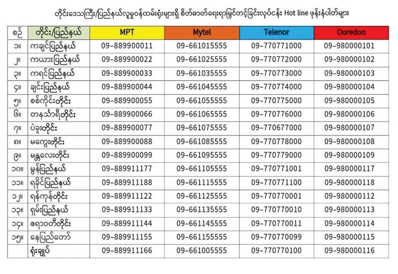 ကိုဗစ်-၁၉ ကပ်ရောဂါကြောင့် စိတ်ဖိစီးမှုလျော့ကျစေရန်နှင့် စိတ်ဓာတ်ရေးရာ မြင့်တက်စေရန် စိတ်ပိုင်းဆိုင်ရာ ပံ့ပိုးမှုပေးခြင်း၊ တွေ့ကြုံရသည့်အခြေအနေ၊ အခက်အခဲများကို ကိုယ်တိုင်ဆုံးဖြတ်ချက်ဖြင့် ဖြေရှင်းကျော်လွှားနိုင်ရန် နှစ်သိမ့်အားပေးပံ့ပိုးမှုပေးခြင်းတို့ကို လူမှုဝန်ထမ်း၊ ကယ်ဆယ်ရေးနှင့် ပြန်လည်နေရာချထားရေးဝန်ကြီးဌာန လူမှုဝန်ထမ်းဦးစီးဌာနက ဖုန်းဖြင့် ဝန်ဆောင်မှုပေးလျက်ရှိကြောင်း သိရသည်။