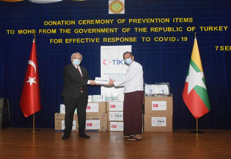 ကျန်းမာရေးနှင့် အားကစားဝန်ကြီးဌာနသို့ တူရကီနိုင်ငံမှ ကိုဗစ်-၁၉ ရောဂါ ကာကွယ်ရေးသုံးပစ္စည်းများ ပေးအပ်လှူဒါန်းပွဲ အခမ်းအနားကို ယနေ့ နံနက် ၁၀ နာရီခွဲတွင် ရန်ကုန်မြို့ ဒဂုံမြို့နယ် ဇီဝကလမ်းရှိ ဆေးသုတေသနဦးစီးဌာန(ရုံးချုပ်) အစည်းအဝေးခန်းမ၌ ကျင်းပသည်။