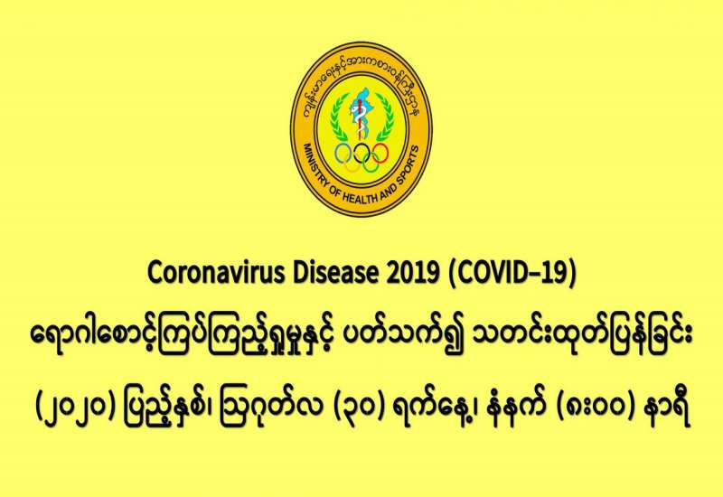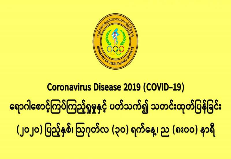 ၁။ (၃၀-၈-၂၀၂၀) ရက်နေ့အတွက် COVID-19 ရောဂါ ဓာတ်ခွဲစစ်ဆေးရာတွင် - - အမျိုးသားကျန်းမာရေးဓာတ်ခွဲမှုဆိုင်ရာဌာန (ရန်ကုန်) (NHL) မှ (ပထမအသုတ်) ဓာတ်ခွဲ နမူနာ (၅၇၀)ခု၊ - ဆေးသုတေသနဦးစီးဌာန (DMR)မှ ဓာတ်ခွဲနမူနာ (၄၁၉) ခုနှင့် - ပြည်သူ့ကျန်းမာရေးဓာတ်ခွဲမှုဆိုင်ရာဌာန (မန္တလေး) မှ (ပထမအသုတ်) ဓာတ်ခွဲနမူနာ (၂၆၄) ခု - စုစုပေါင်း (၁,၂၅၃)ခု အား ယနေ့၊ ညနေတွင် စစ်ဆေးပြီးစီးခဲ့ရာ - • COVID-19 ရောဂါ ဓာတ်ခွဲအတည်ပြုလူနာသစ် (၂၆) ဦး တွေ့ရှိရပါသည်။