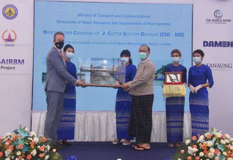ဧရာဝတီမြစ်အတွင်း ရေလမ်းဖွံ့ဖြိုးရေးလုပ်ငန်းများကို ထိထိရောက်ရောက် ဆောင်ရွက်နိုင်ရန်အတွက် နယ်သာလန်အခြေစိုက် DAMEN SHIPYARDS GORINCHEM ကုမ္ပဏီမှဝယ်ယူခဲ့သော အရည်အသွေးမြင့် “ဧရာမောင်” နှင့် “သလ္လာမောင်” သောင်တူး ရေယာဉ်အသစ် နှစ်စီး (Cutter Suction Dredger-CSD 500)အား ရေအရင်းအမြစ်နှင့် မြစ်ချောင်းများဖွံ့ဖြိုးတိုးတက်ရေး ဦးစီးဌာနသို့ လွှဲပြောင်းပေးအပ်ပွဲအခမ်းအနားကို ယနေ့ နံနက် ၉ နာရီတွင် ရန်ကုန်မြို့ ကမာရွတ်မြို့နယ် ဘုရင့်နောင်လမ်းရှိ JV of Myanmar Shipyards-AMECC ရုံးဝင်းအတွင်း၌ ကျင်းပသည်။